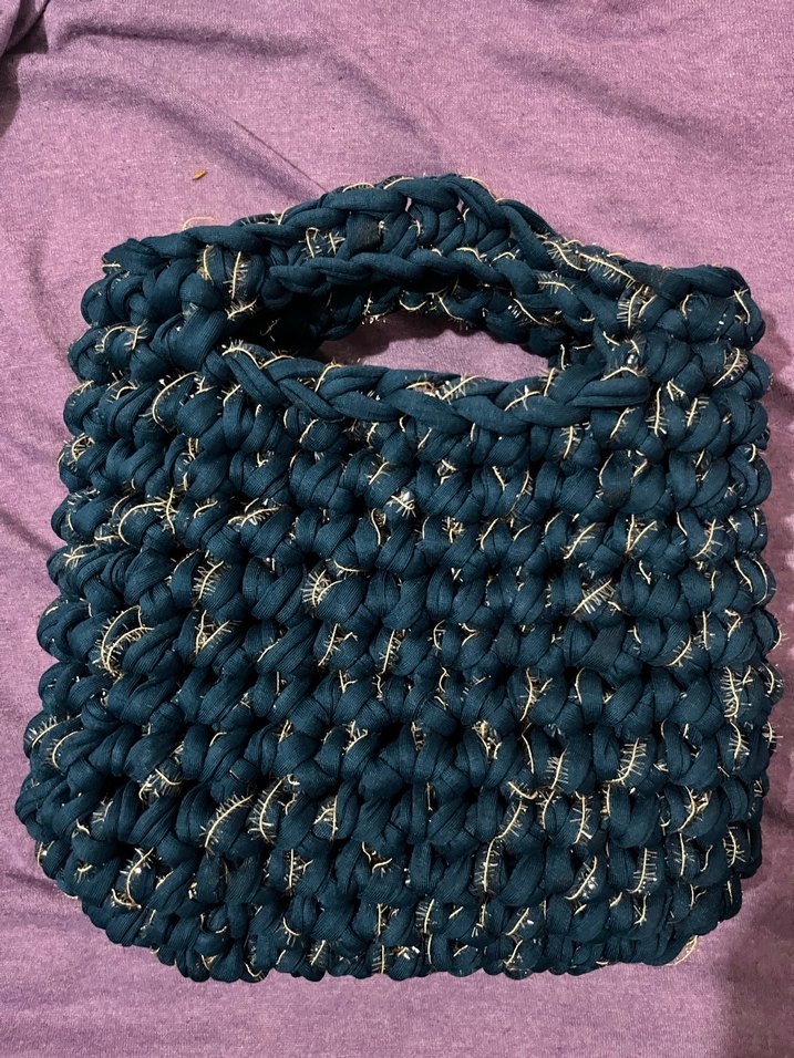 Koyu mavi renkte, kalın iplikle örülmüş kadın çantası. Sade ve desensiz tasarımıyla rahat, bohem tarz sunar. Günlük kullanıma uygundur.