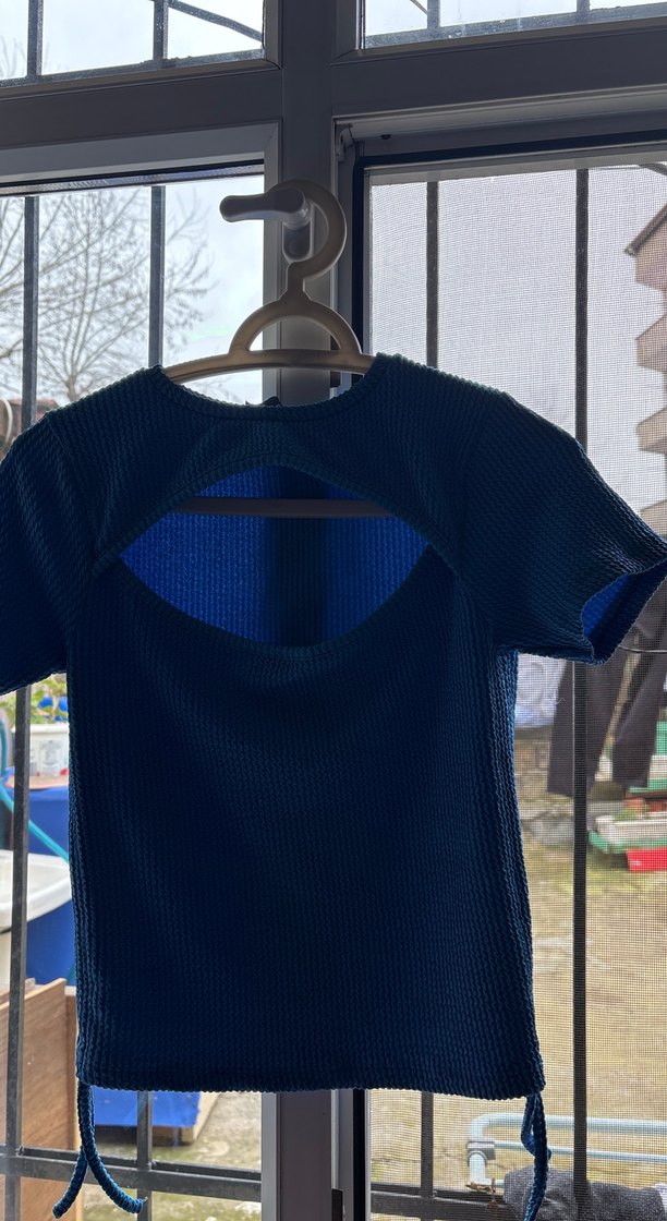 Koyu mavi renkli, örgü yapıda, kısa kollu ve bisiklet yakalı, normal boyda, dar kesim hamile tişörtü. Sokak modasına uygun athleisure tarzda tasarlanmıştır.