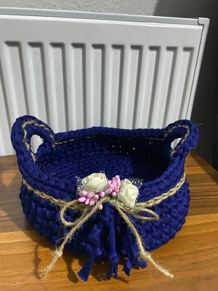 Koyu mavi renkli, saplı örgü sepet. Üzerinde küçük fiyonk ve yapay çiçek süslemeleri bulunur.