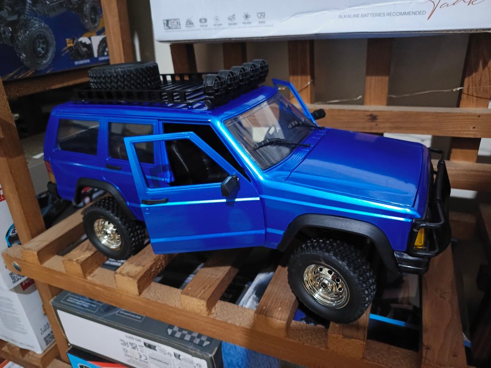 1/12 7.4 volt Koyu mavi oyuncak araba, açılabilir kapılar ve sağlam lastiklere sahip, arazi aracı görünümünde.