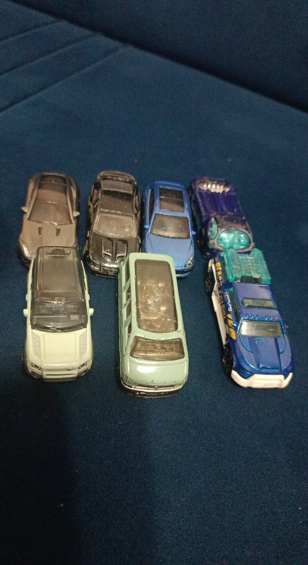 Farklı tasarımlarda koyu renkli yedi adet oyuncak araba seti, mavi ve yeşil tonlarında. Koleksiyon veya oyun için uygun.