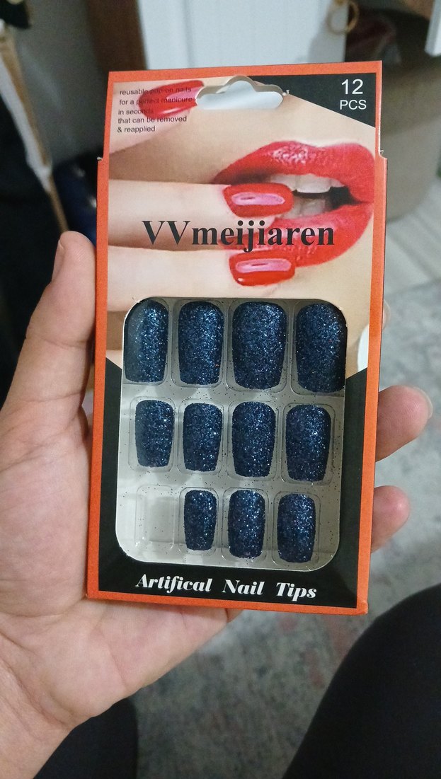 Koyu mavi ve parlak simli yapay tırnak uçları, 11 parçadan oluşan set ile şık tırnak süsleme sağlar.