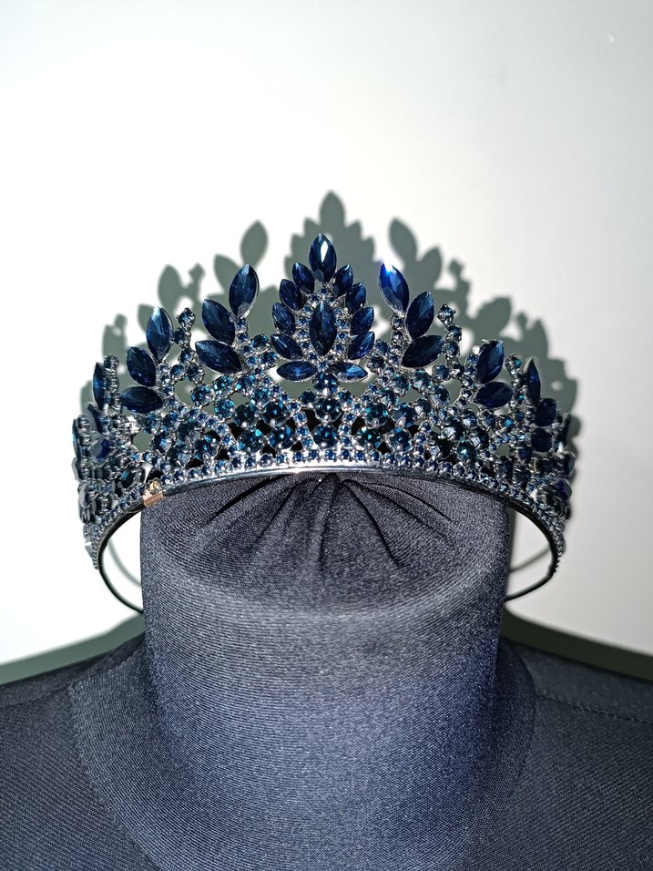 Koyu mavi payetli sentetik kumaştan yapılmış, gotik tarzda klasik zarafet sunan taç. Gösterişli etkinlikler için uygun.