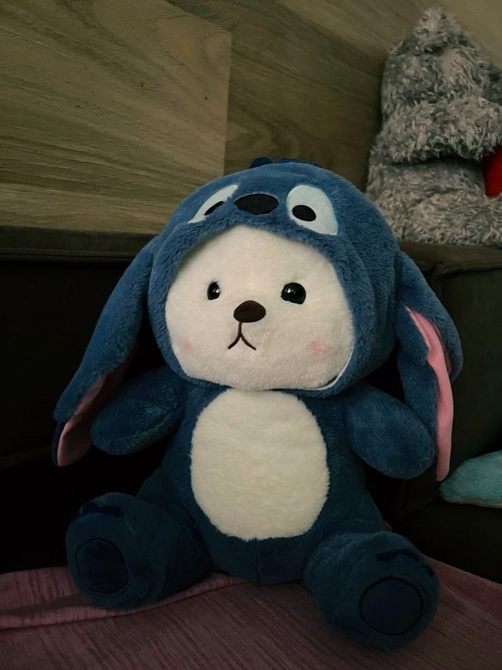 Koyu mavi renkli, uzun kulaklı sevimli bir hayvan kostümü giymiş yumuşak peluş oyuncak ayıcık. Sarılmalık ve rahatlatıcı bir arkadaş.