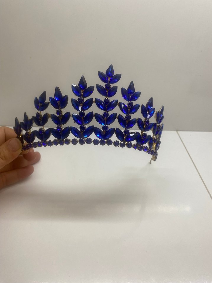 Koyu mavi pul işlemeli, yaprak şekilli detaylara sahip kadın saç tacı. Avant-garde ve sade tarzı yansıtır.