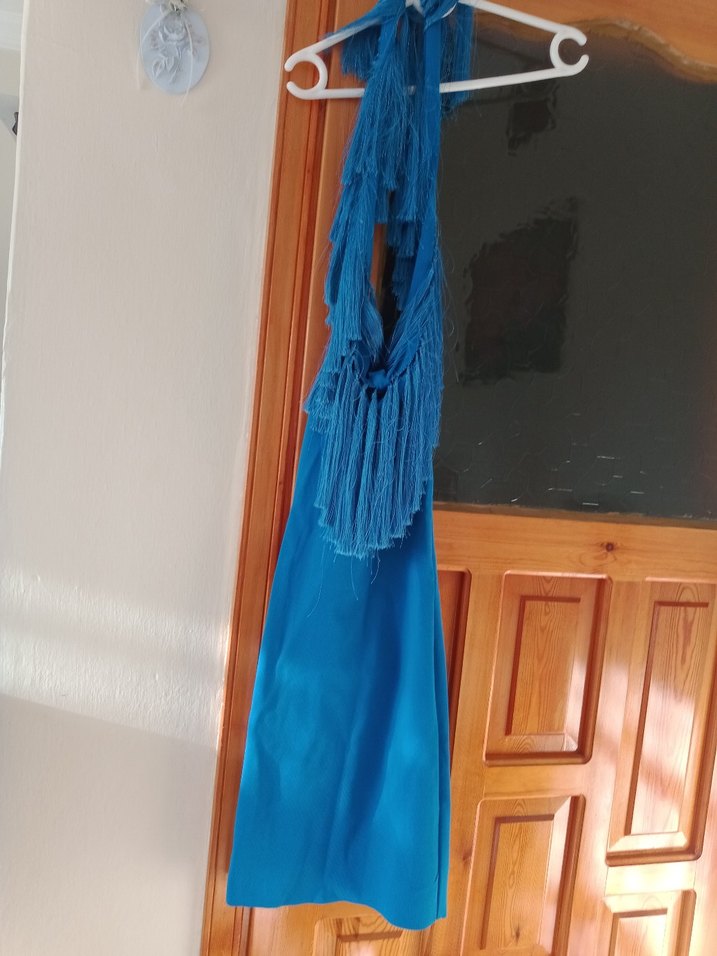 Koyu mavi renkli,omuzlardsn baglamalı püskül detaylı elbise sorunsuz