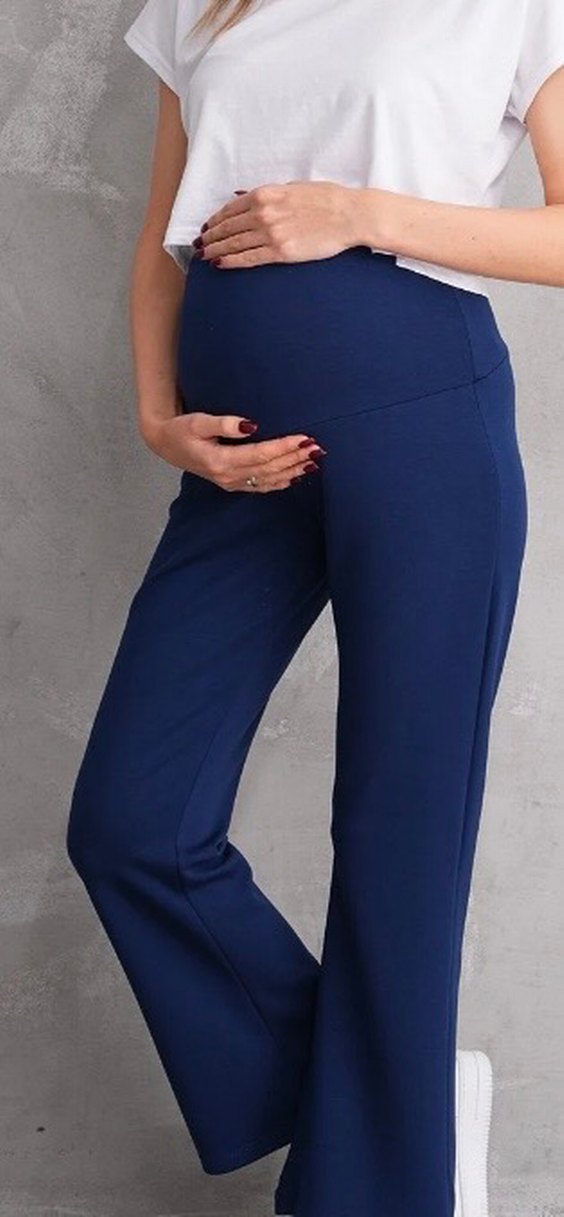 Koyu mavi, rahat kesim ve normal boyda hamile pantolonu. İpeksi kumaştan, günlük kullanım için zahmetsiz şıklık sunar. Beli ayarlamalı lastik bedenleri mevcut