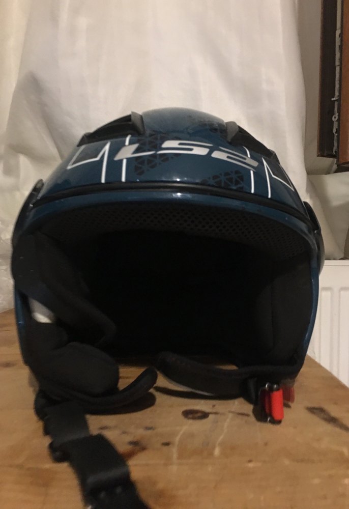 Koyu mavi plastik motor kaskı, tokalı kayışlı ve rock punk tarzında sokak stiline uygun. Düz yüzey ve şık görünüm. ️