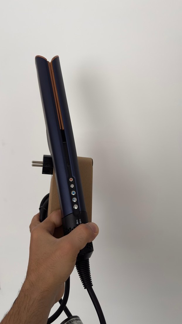 Koyu mavi saç düzleştirici, sıcaklık kontrol düğmeleri ve kolay kullanım için döner kabloya sahiptir. Saçları düz ve parlak yapar. ♀️dyson