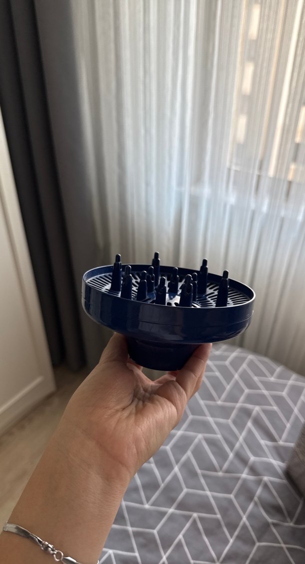 Saç hacmini ve dokusunu artırmak için tasarlanmış koyu mavi saç kurutma makinesi difüzörü. Çoğu standart saç kurutma makinesine uyum sağlar.