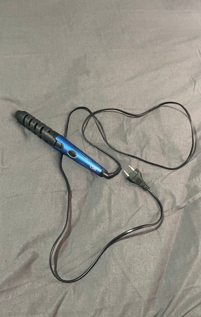 Koyu mavi renkte, saçları kıvırmak için spiral varilli saç şekillendirici. Uzun güç kablosu ve fişi bulunur.