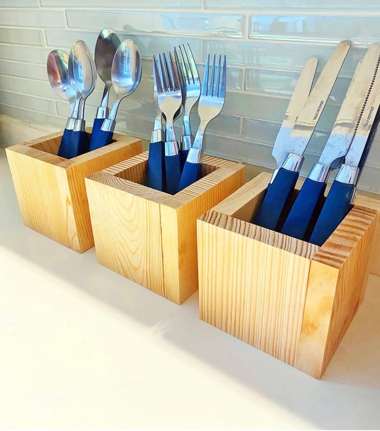 Koyu mavi saplı çatal, bıçak ve kaşık seti, ahşap kutularda düzenli şekilde saklanıyor. Saplar kolay tutuş sağlar.
