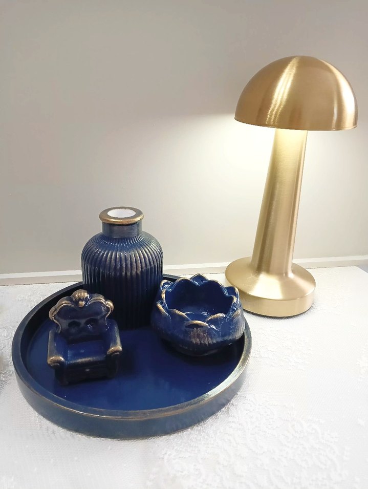 Koyu mavi seramikten yapılmış, yuvarlak tepsi, oluklu vazo, çiçek şeklinde kase ve küçük sandalye şeklinde kap içeren dekoratif set.