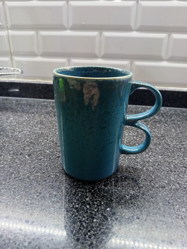 Koyu mavi seramikten yapılmış, çift kulplu tasarıma sahip kupa, içecekleriniz için şık ve kullanışlıdır. ☕