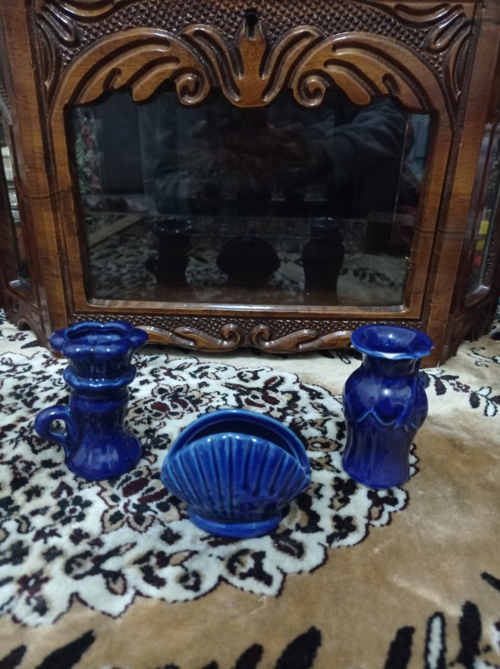 Koyu mavi seramik vazolar ve deniz kabuğu şeklinde dekoratif parça içeren set.