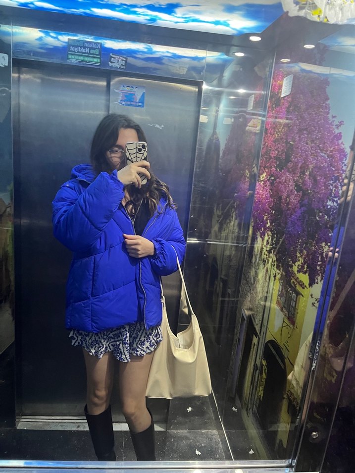 Koyu mavi, puff detaylı, yüksek yakalı ve uzun kollu, midi boy günlük sokak stili mont. Sıcak ve yumuşak kumaştan, gençler için uygun.