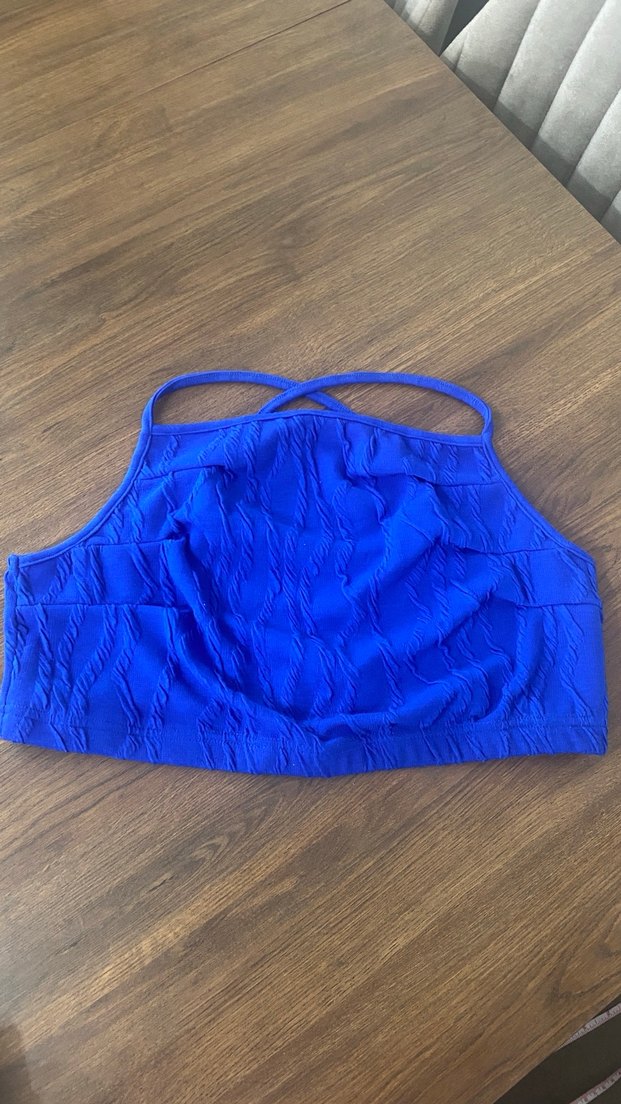 Koyu mavi renkte, çapraz askılı, midi uzunlukta, düz tasarımlı spor büstiyer.