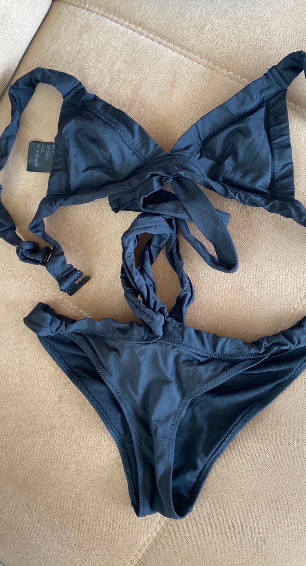 Koyu mavi, strappy askılı, bohem tarzda, vücuda oturan bikini. Plaj için rahat ve şık görünüme sahip. H&M