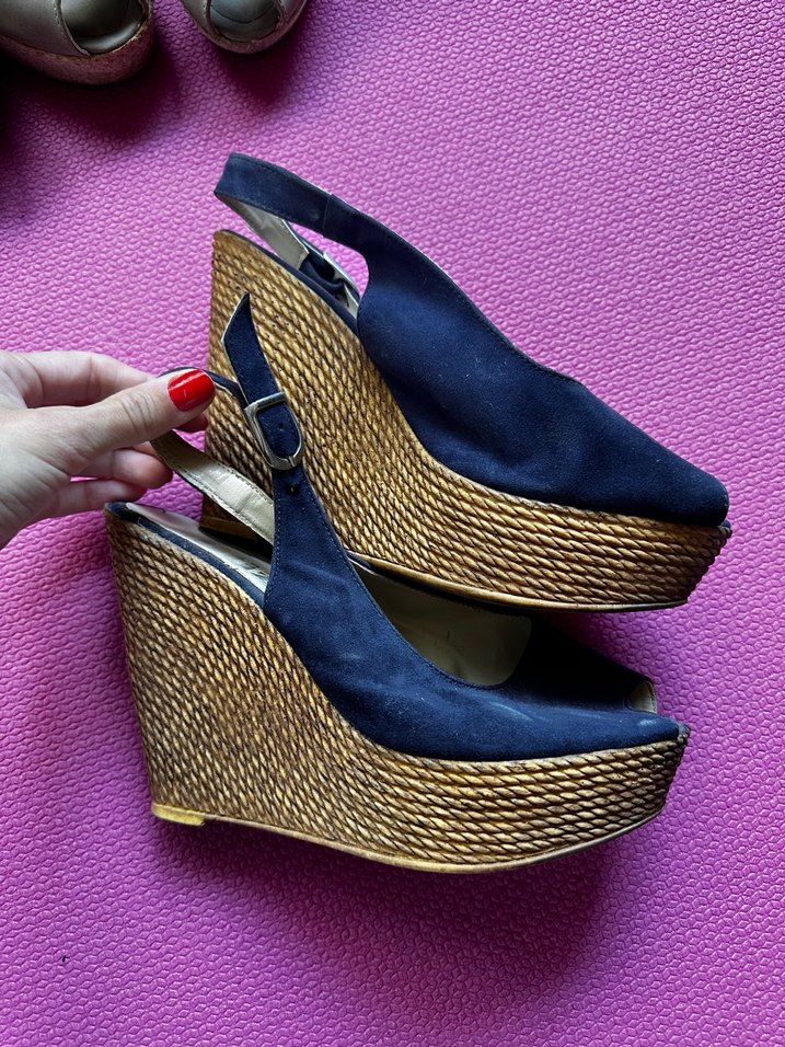 Koyu mavi süet dolgu topuklu ayakkabılar, tokalı bant ve dokulu topuk detayıyla romantik akşamlar için uygundur.