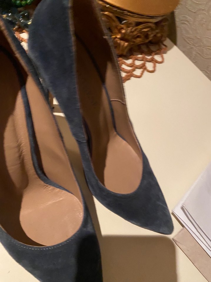 Koyu mavi süet malzemeden, sivri burunlu kadın stiletto ayakkabı. İnce stilettosu klasik ve zarif bir görünüm sunar.