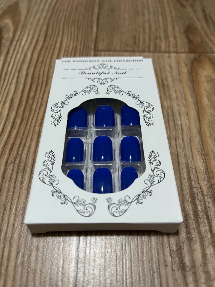 Parlak yüzeyli koyu mavi takma tırnaklar, süslü kutusunda kolay uygulama için hazır. 24 adet tırnak 24 adet yapıştırıcı bir adet törpü