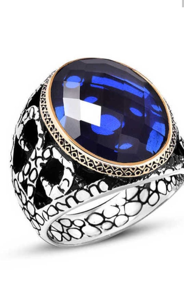 Koyu mavi faset kesim taş ve detaylı gümüş tasarımıyla klasik ve modern tarzı birleştiren erkek yüzüğü.