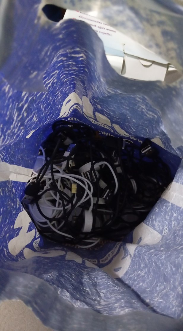 Koyu mavi renkte, farklı cihazlara uyumlu çeşitli telefon şarj kabloları, bir poşetin içinde yer alıyor.