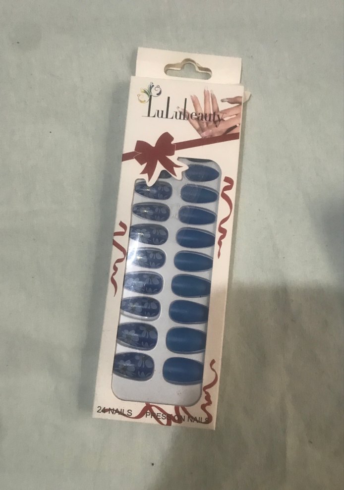 LuLuBeauty markalı mavi renk takma tırnak bir set mavi üstü papatya desenli bir set düz mavi renk bulunmaktadır çok hoş ve kullanışlılar ister karışık renkli ister sade takabilirsiniz toplam 2 çift tırnak seti var yanında 72 li tırnak yapıştırıcısı hediye ediyorum yapıstırıcılar çift taraflı tekrar kullanabilirsiniz tekliflere açığım
