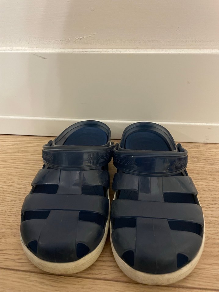 Koyu mavi renkte, tokalı ve kauçuk tabanlı erkek çocuk terliği. Düz ve desen içermeyen sokak stili için uygundur.
