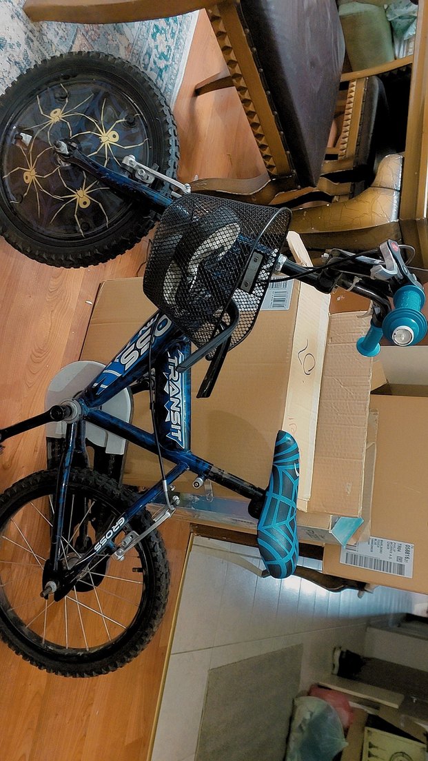 Koyu mavi renkte, rahat oturaklı ve ön sepetli üç tekerlekli bisiklet. Dayanıklı tekerlekleri ile çocuklar için uygun.