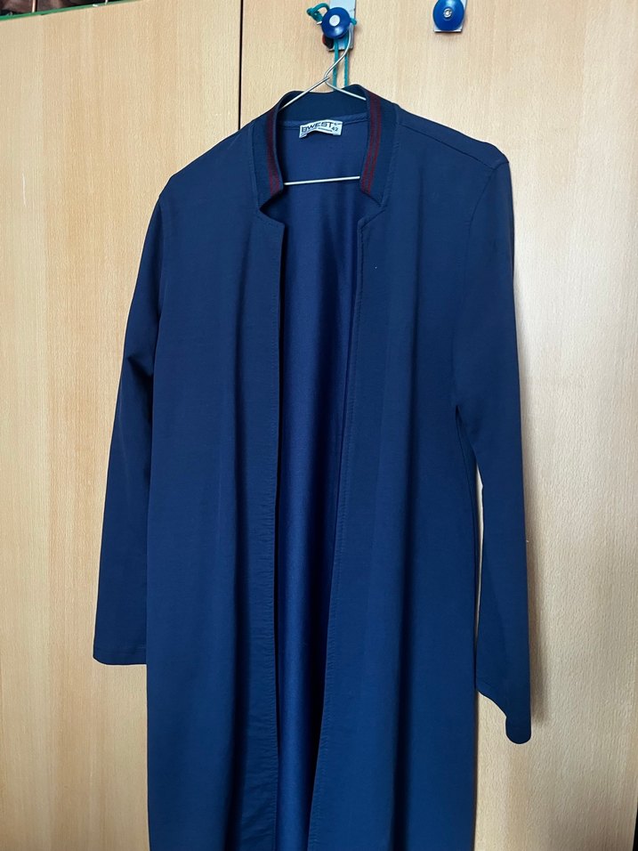 Koyu mavi renkte, uzun boylu, açık yakalı ve uzun kollu kadın kabanı. Rahat kesim, dökümlü tarzda, yumuşak ve sıcak kumaştan üretilmiştir. Ofis için uygun, sade ve mütevazı tasarım.