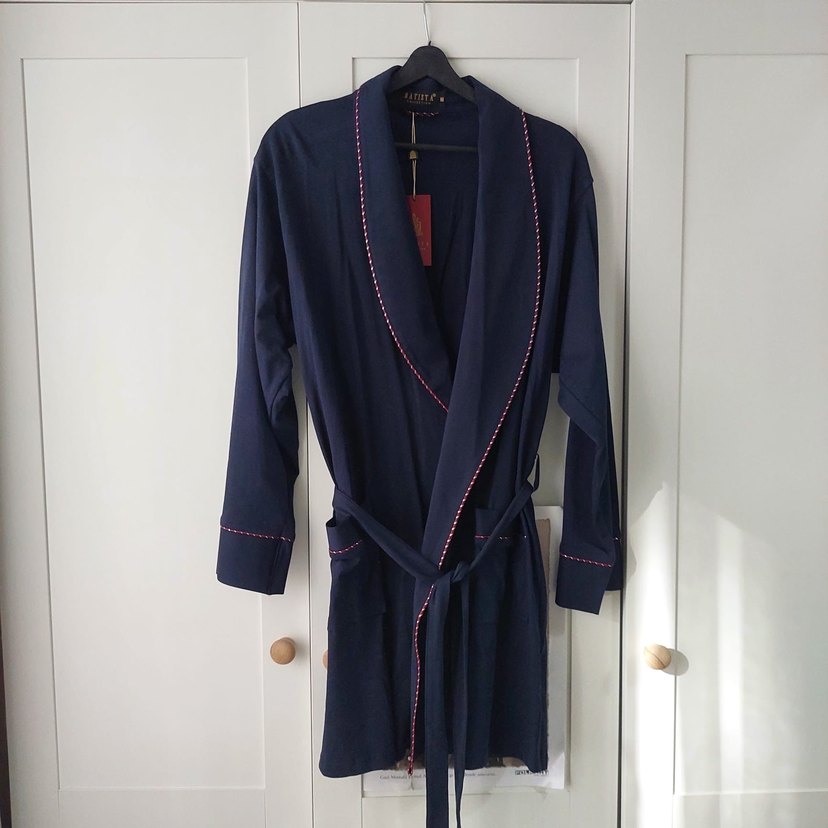 Koyu mavi renkte, uzun kollu ve uzun boyda kadın sabahlık. Modern klasik tarzda, yakada ve manşetlerde ince pembe dikiş detayları bulunur. Kemerli ve desensizdir. ️