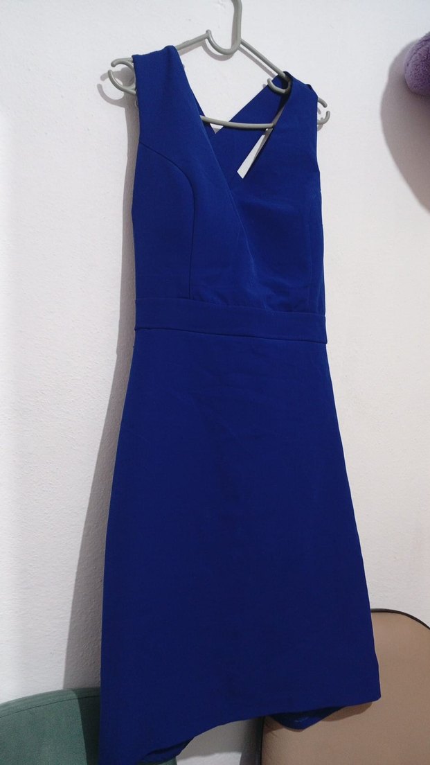 Koyu mavi, v yakalı ve kolsuz, kemerli bu dar kesim midi elbise, çağdaş minimalist stil sunar ve ofis kullanımına uygundur.