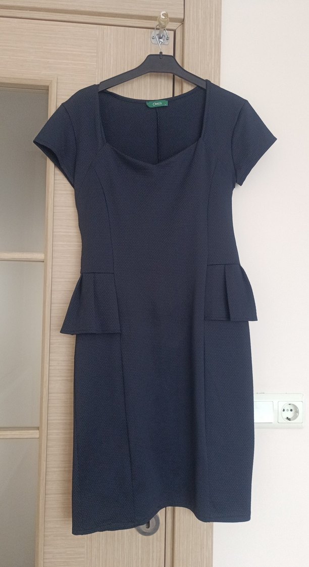 Koyu mavi renkte, V yakalı ve kısa kollu midi boy elbise. Bel kısmında pileli detaylar bulunan, ofis için uygun regular fit model. ✨