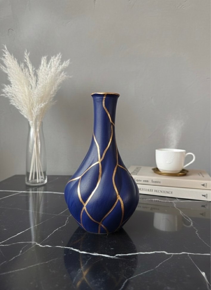 Koyu Mavi ve Altın Detaylı Vazo