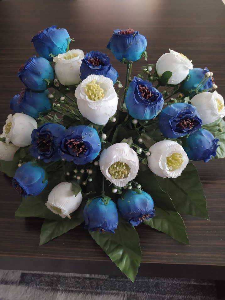Koyu Mavi ve Beyaz Yapay Çiçekli