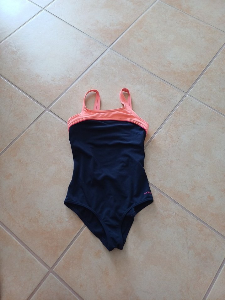 İnce pembe askılı, koyu mavi renkli, oturan kesime sahip kız mayosu, plajda kullanıma uygun sade ve cesur bir tasarıma sahiptir.