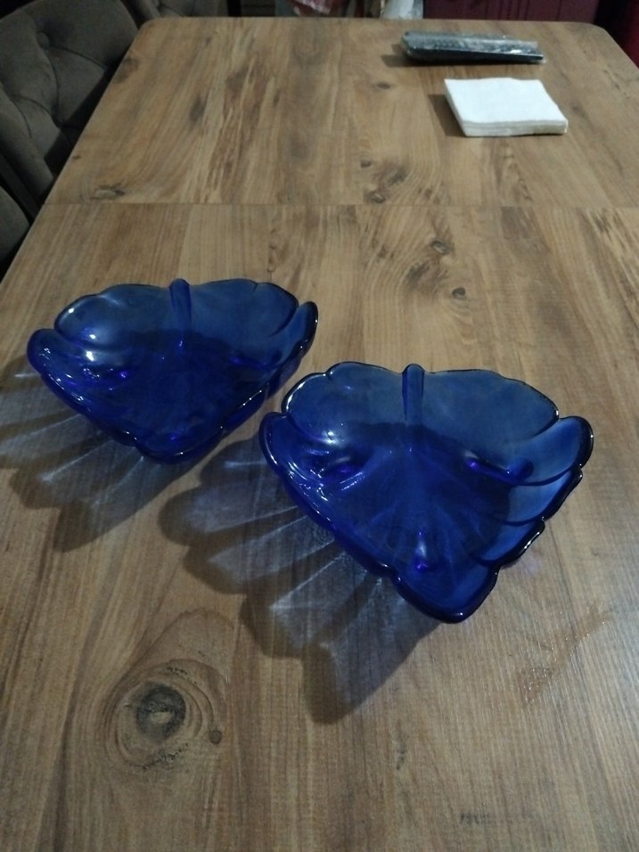 Koyu mavi renkte, vintage tarzda, desen içermeyen iki cam tabak. Servis için uygundur. ️