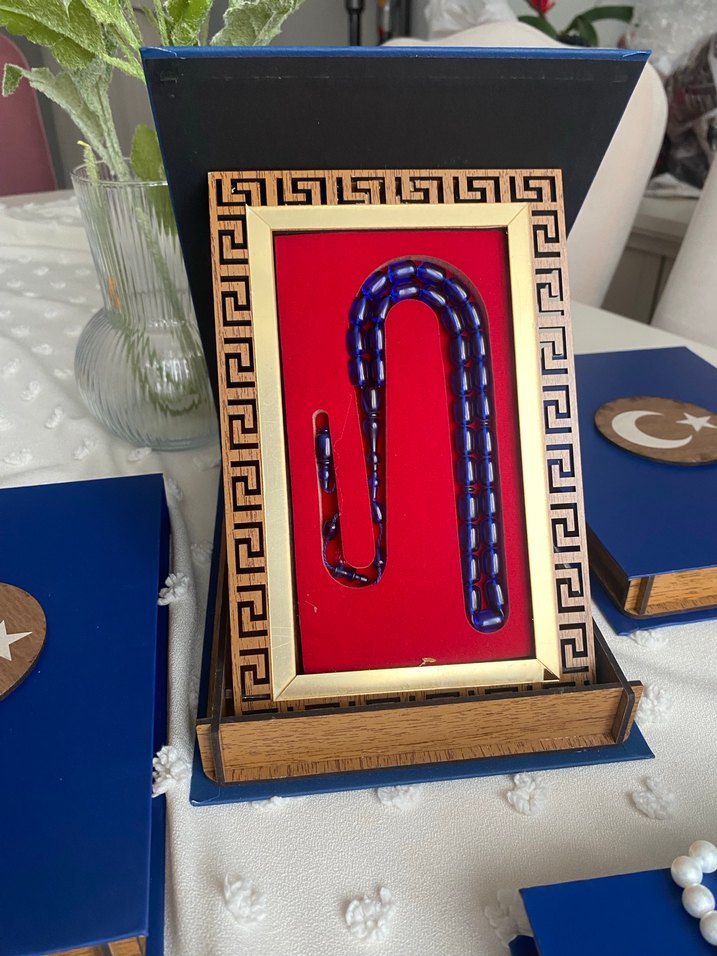 Koyu mavi renkli, klasik tarzda erkek tesbih. Parlak ve düzgün boncuklardan oluşur. Geometrik desenli şık ahşap çerçevede sunulur.