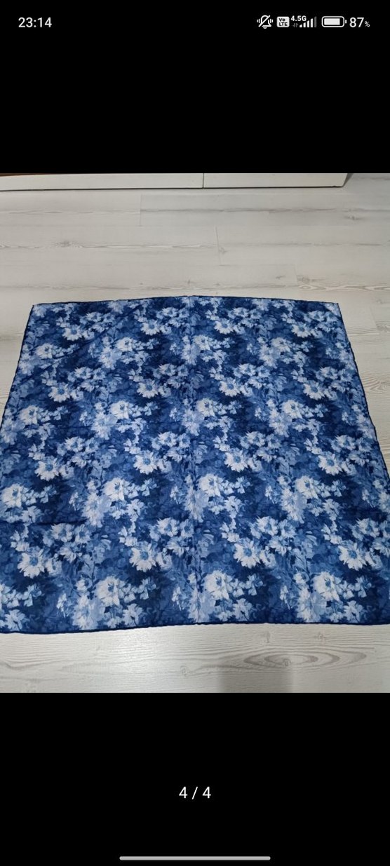 Koyu mavi vintage fular, çiçek desenli ve fırfırlı, bohem tarzında. Yumuşak sentetik kumaştan yapılmıştır.