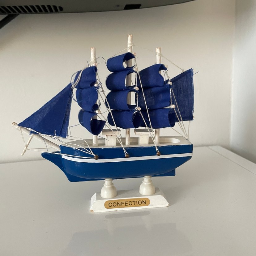 Koyu mavi kumaş yelkenlere sahip, beyaz kaideli ve üzerinde 'CONFECTION' etiketi bulunan yelkenli gemi figürü. Dekoratif amaçlıdır. ⛵