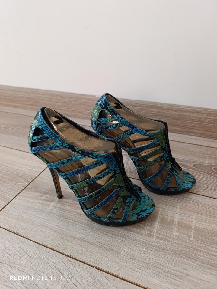 Koyu mavi yılan derisi desenli, çoklu bantlı ve tokalı yüksek topuklu ayakkabılar. Romantik akşamlar için modern ve avangart tarzda, kauçuk malzemeden üretilmiştir.