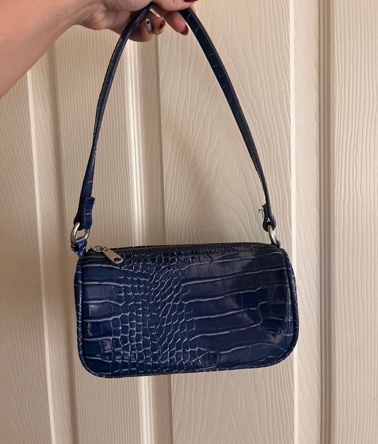 Koyu mavi yılan desenli deri kadın çanta, tokalı askıya sahip, trend sokak stili için uygun. Defosu yoktur