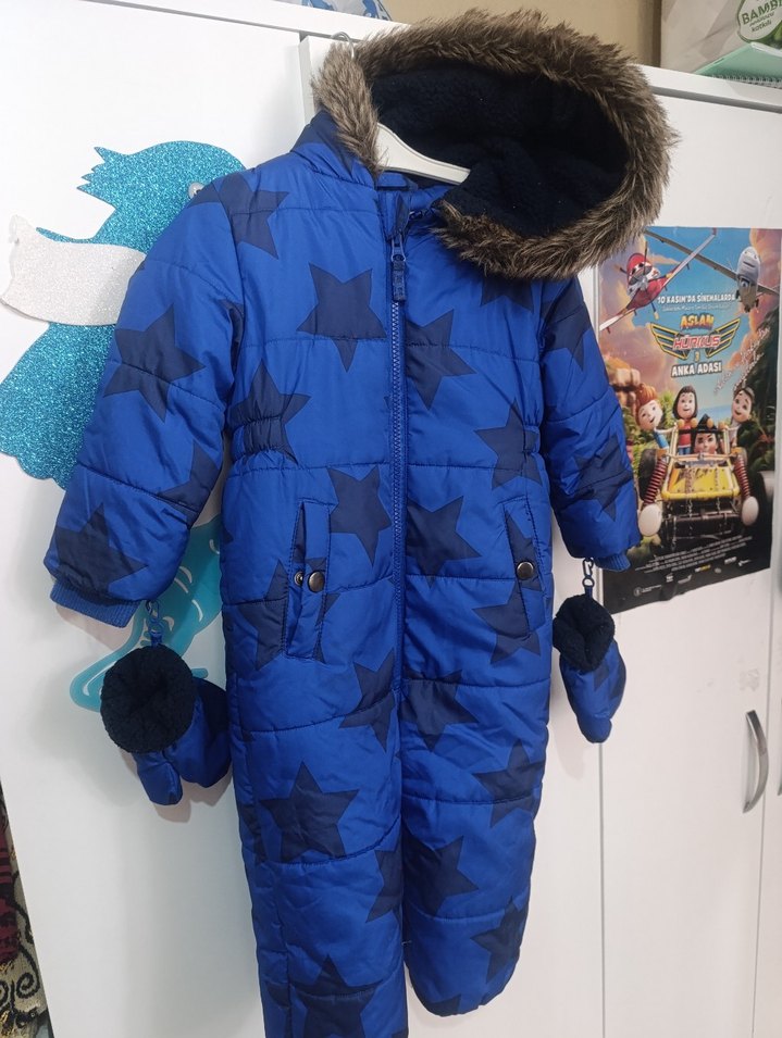 Koyu mavi, yıldız desenli kar tulumu, kürklü kapüşon ve eldiven detaylarına sahiptir. Yumuşak ve sıcak kumaştan üretilmiştir. ❄️
