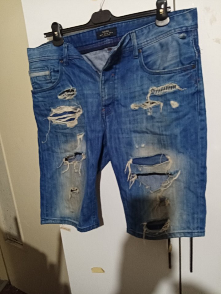 kadınlar için bol kesim, koyu mavi denim şort, yırtık detaylı ve tokalı, rahat sokak stili için uygundur.