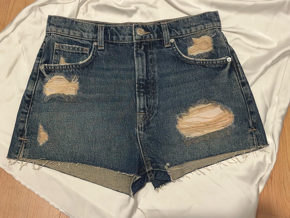 Koyu mavi kot şort, bol kesim ve yırtık detaylara sahip. Tokalı tasarımı ve kısa boyuyla gündelik kullanıma uygun.