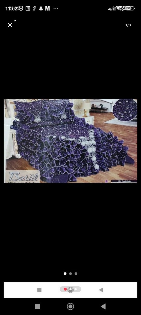 Koyu mor renkli baskılı yatak örtüsü, fırfırlı detaylarla dokusal bir görünüm sağlar. Yatak odasına zengin ve sıcak bir hava katar. ️