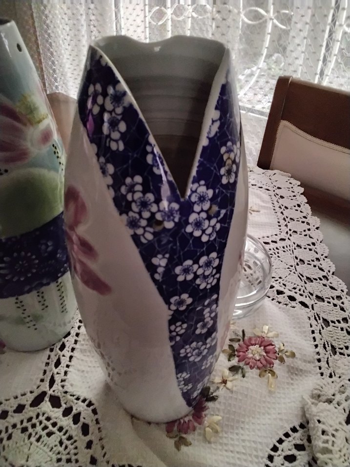 Koyu mor çiçek desenli, şık şekle sahip dekoratif vazo. porselen