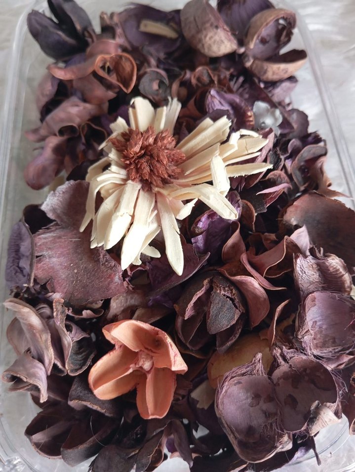 Koyu mor renklerde, doğal görünümlü kurutulmuş çiçek detaylı süsleri seti.