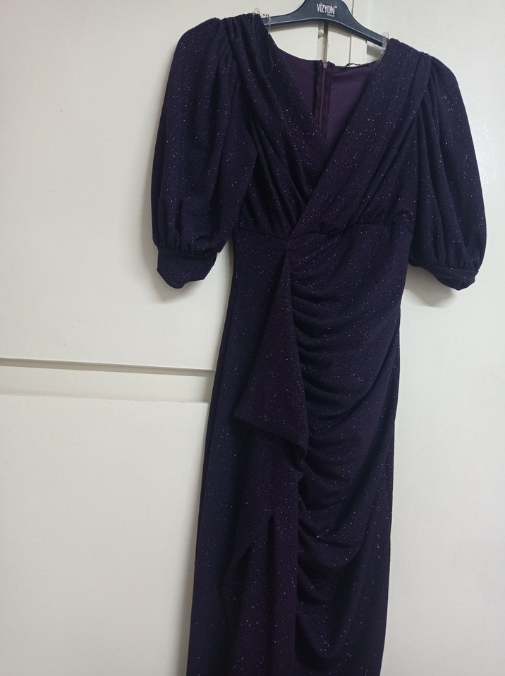 Koyu mor renkte, V yakalı ve askılı kollu, drapeli uzun ve vücuda oturan abiye elbisedir. esnek 36-38 beden uyumlu ✨ 1 defa giyildi